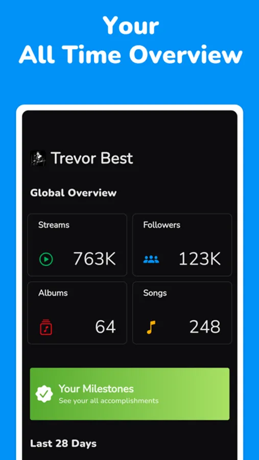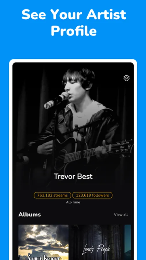 • View your real time statistics about you, your albums and songs.