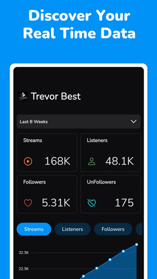 • View stream, listener, follower and unfollower count by pre-selected or custom date range.