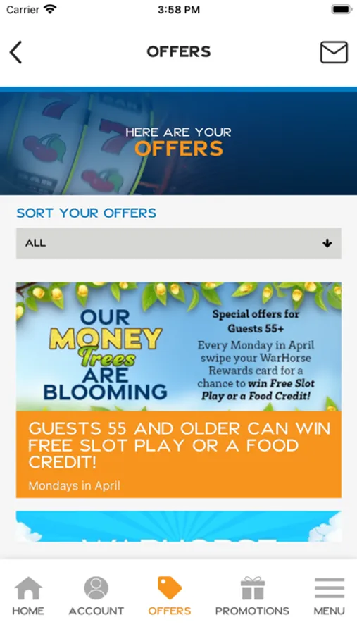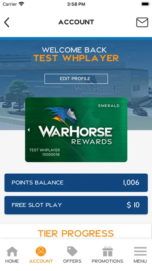 WarHorse Rewards Members can log in via the Account page to get the most out of the WarHorse Casino app! By logging in you’ll be able to view special offers like points and free slot play.