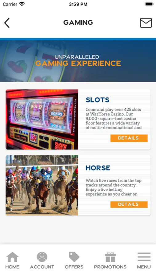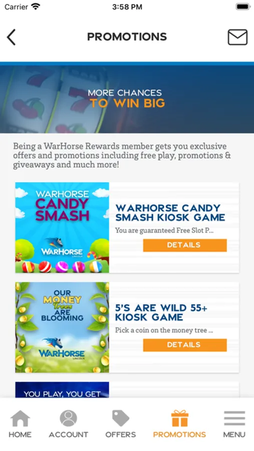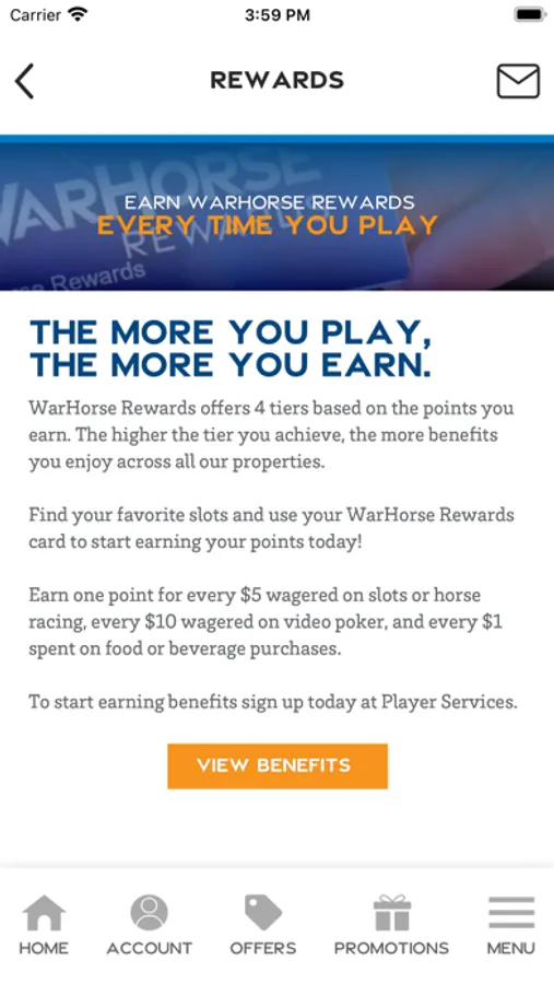 The WarHorse Casino mobile app gets you instant access to exciting promotions, special offers and more. For WarHorse Rewards Members, the experience gets even better. Log in to view point balances and access personalized offers.