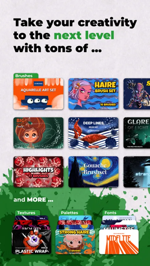 • Unlimited access to all 2000+ brushes, fonts, palettes, etc.