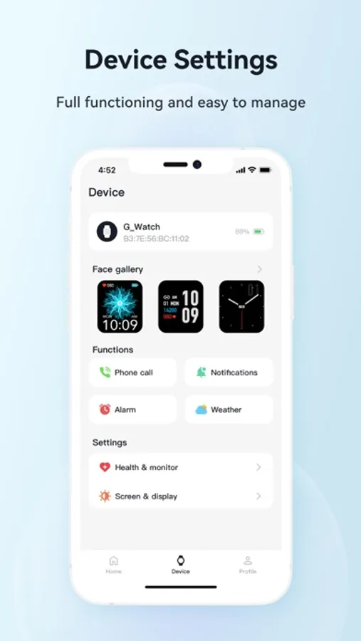 * Convenient to manage wearable device, set up functions, synchronize data.