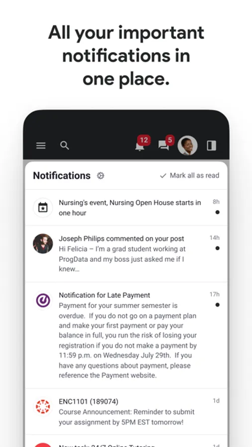 - Receive key notifications from EZ-Arts, Canvas, Registrar and Student Accounts.
