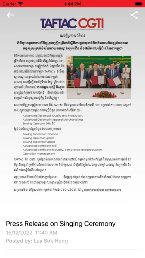 Recognizing the need to grow the skilled workforce for the garment industry as well as narrow the gap between training needs and existing job matches in Cambodia, the Textile, Apparel, Footwear & Travel Goods Association in Cambodia (TAFTAC) sought for companies to set up Cambodian Garment Training Institute (CGTI) with the aim of providing qualitative and quantitative capacity building goals.