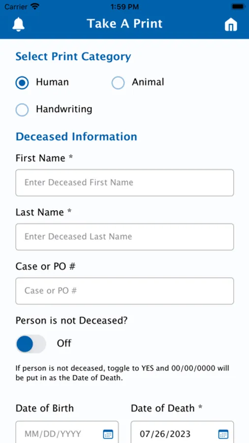 This app allows the Funeral Director to take Human Prints (finger, toe, hand, and foot), Animal Prints (paw, nose) or Handwriting Prints with the camera from the phone or from a Bluetooth-enabled scanner.