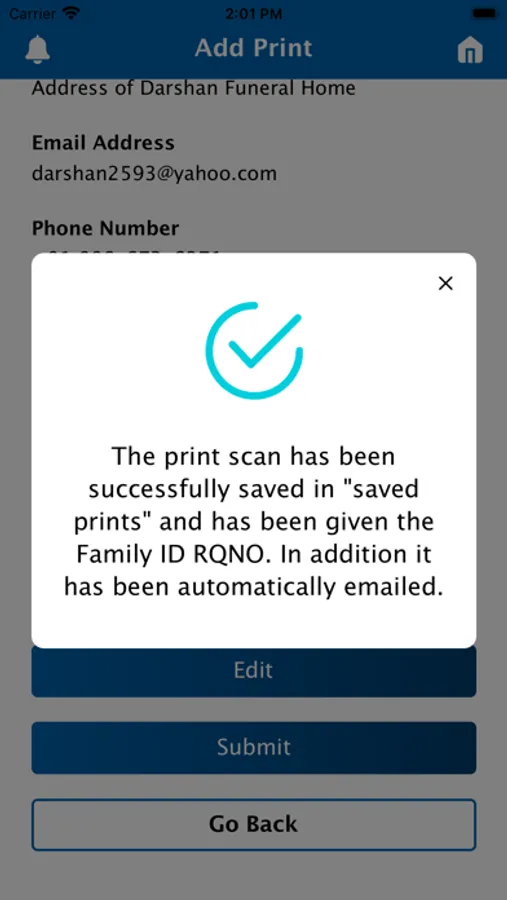 Every print submitted is automatically emailed to Crescent Memorial and to the user and is saved on the phone.