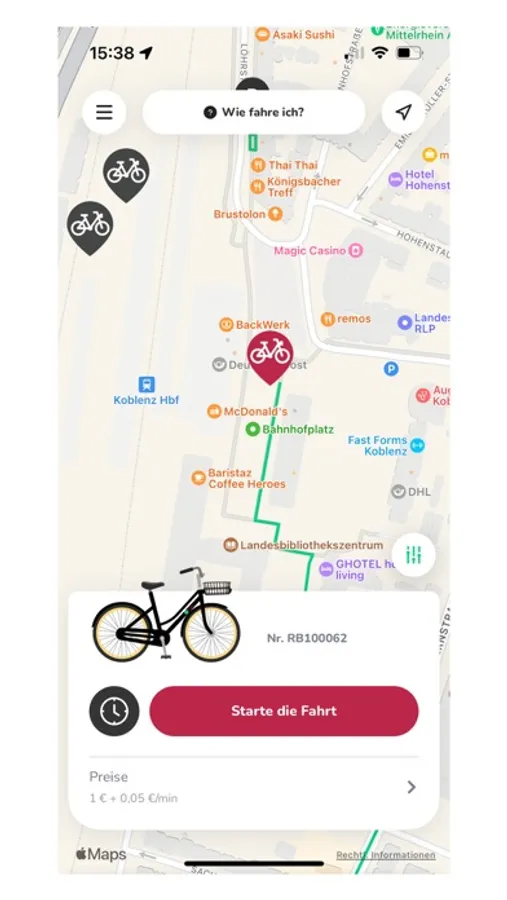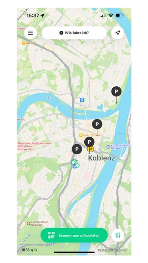 Über unsere App für Apple Geräte können Sie ganz einfach unsere Rhein Bike Sharing Räder 24/7 im Mittelrheintal ausleihen. Nach der Installation können Sie sich in der App registrieren, eine Zahlungsart hinterlegen und Guthaben aufladen. Über die integrierte Kartenfunktion sehen Sie in Ihrer Nähe verfügbare Räder. Sobald Sie am Fahrrad sind scannen Sie den QR-Code am Schloss um das Fahrrad aufzuschließen und loszufahren.