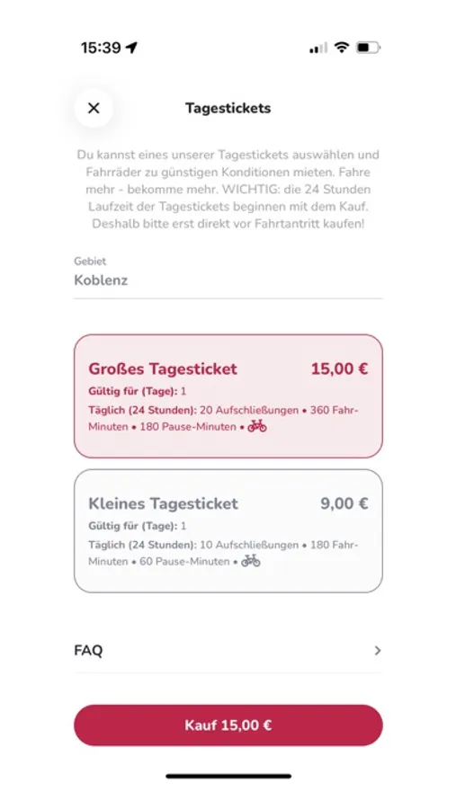 Das große Tagesticket für €15 ist perfekt für längere Fahrten an Rhein, Mosel oder Nahe da es volle 12 Stunden Fahrtzeit und 12 Stunden Pausenzeit pro 24 Stunden beinhaltet. 20 Aufschließungen sind inbegriffen, jede weitere Aufschließung kostet €1.