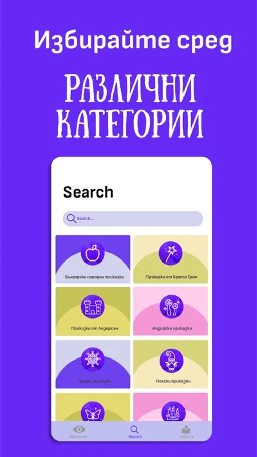 В приложението ПРИКАЗКИТЕ ще чуете, както любимите български народни приказки, така и класически истории на Братя Грим, Шарл Перо и Андерсен, освен това ще откриете приказки от Япония, Русия, Гърция, Италия, Грузия, Африка и други.
