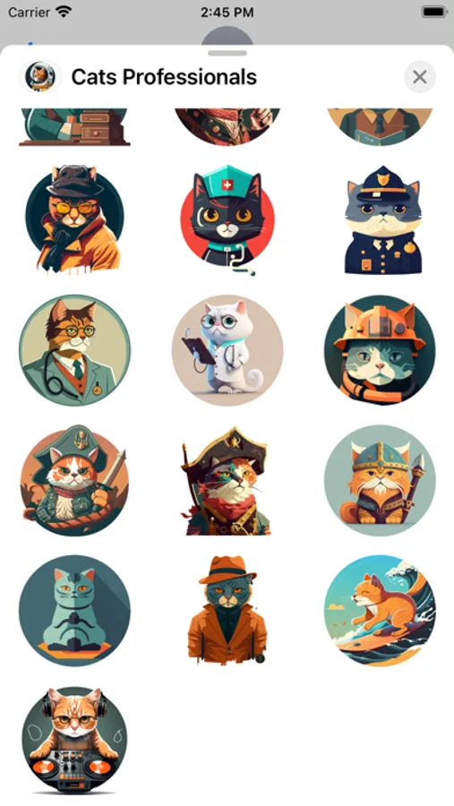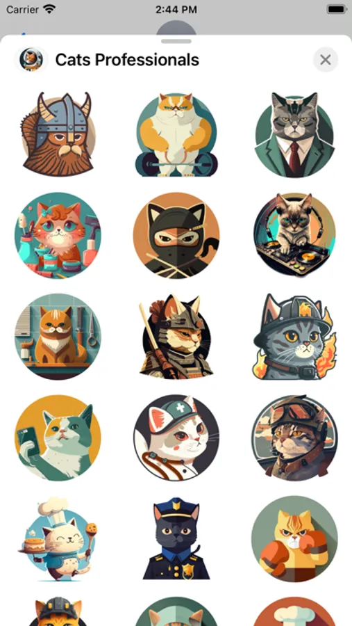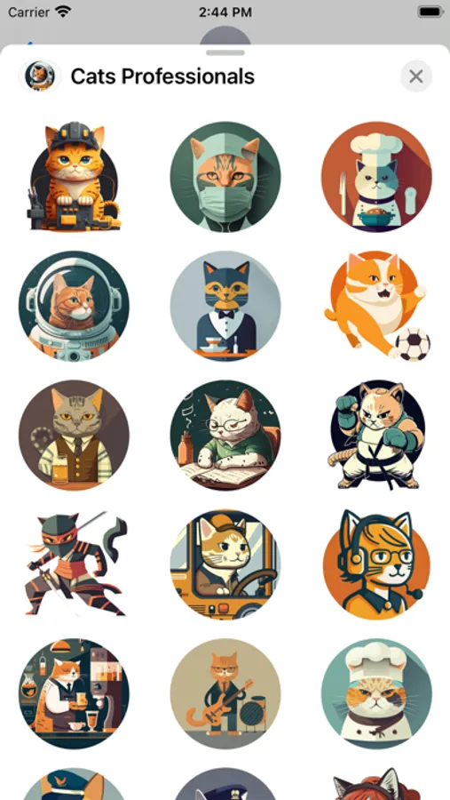 A set of stickers for iMessage with professional cats. The set includes a pilot cat, a boxer cat, a bartender cat, a police cat and even an astronaut cat.