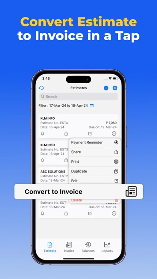 Create & Share PDF Sales Invoices & Estimates, Convert Estimate to Invoice on a Single Tap. Get Paid faster with our CRM app to track receivable & send gentle overdue invoice reminders.