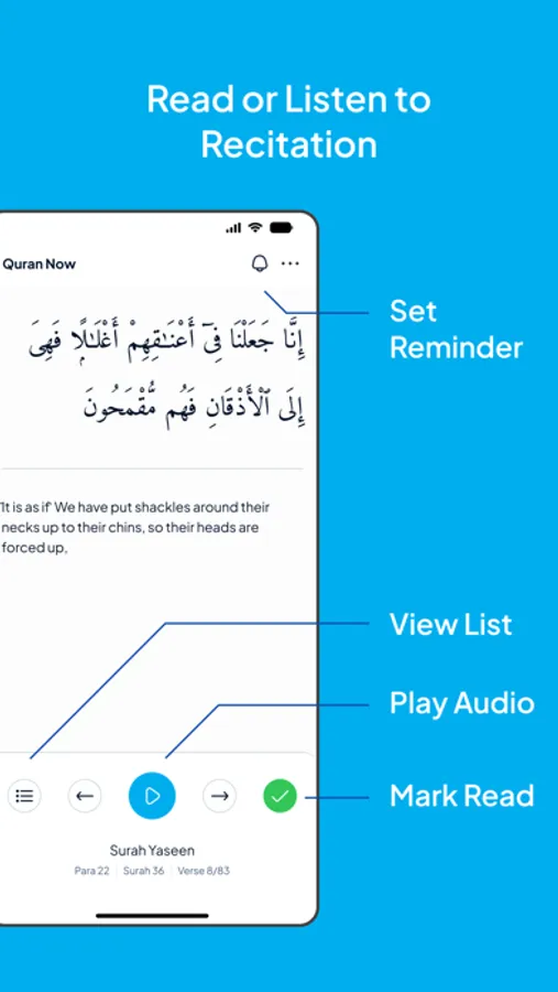 The main idea is to restore the habit of reading Quran on daily bases. The app will keep track of the already read verses.