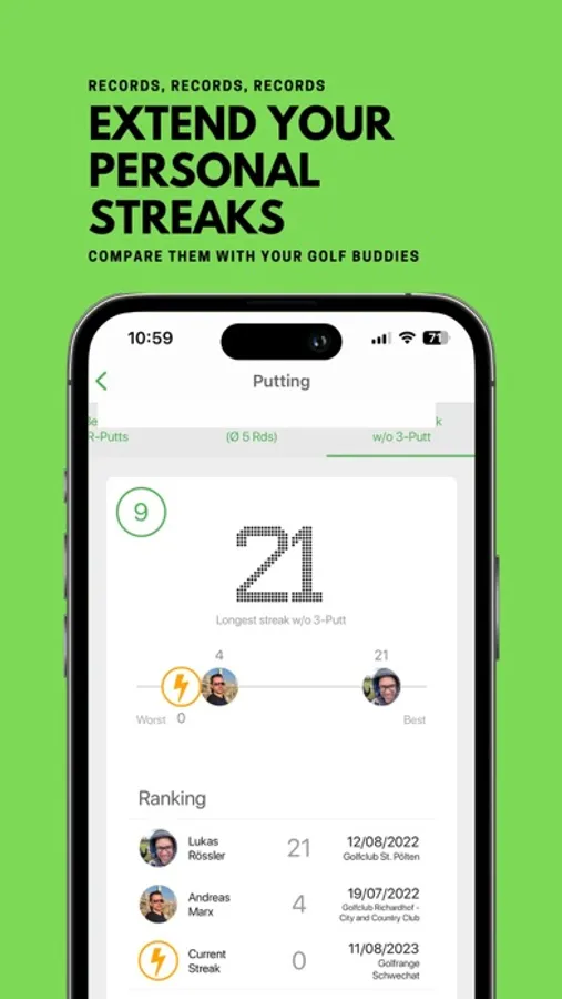 Golf is more fun with friends! You can compare stats, golf streaks, and golf records with your golfing buddies. Our live ticker keeps you updated on their scores in real-time, letting you cheer them on or add a bit of friendly competition. Share your milestones and personal bests on social media, and watch your golf community grow.