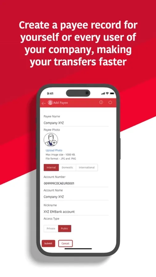 With EMBank Mobile, you can submit your TARGET2 transactions and perform SEPA payments online. You can also transfer money between your accounts and create a payee record for yourself or every user of your company, making your transfers faster and hassle-free.