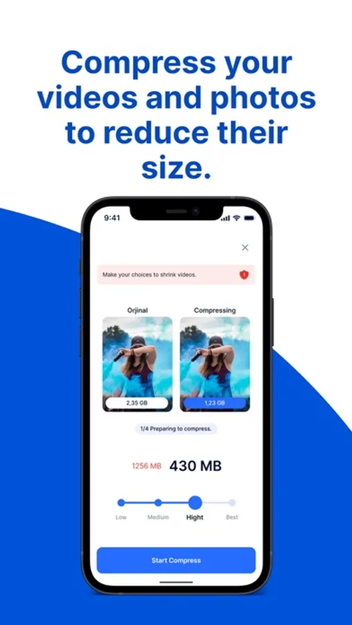 You can gain significant storage space by compressing videos that you don't want to delete. Compression process will not visibly damage your video quality. You can also compress photos in bulk for your high-size photos.
