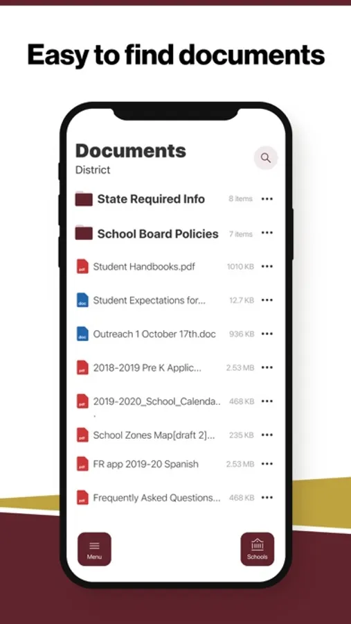 The event section shows a list of events throughout the district. Users can add an event to their calendar to share the event with friends and family with one tap.