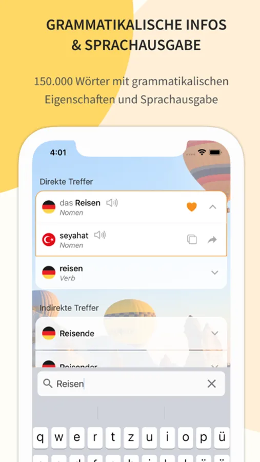 Die App bietet umfassende Informationen über die grammatikalischen Eigenschaften von Wörtern und Vokabeln.