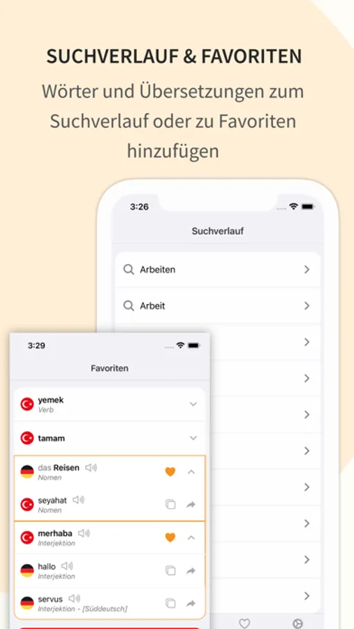 Organisiere Deine Suche ganz einfach, indem Du Wörter und Übersetzungen zum Suchverlauf oder zu Favoriten hinzufügst.