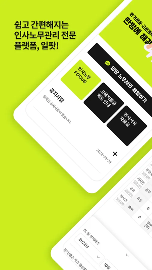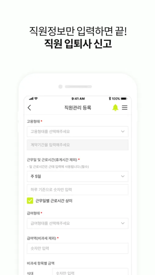 직원 인적사항을 입력하면 담당 급여매니저가 확인 후 근로복지공단, 국민건강보험공단, 국민연금공단에 각각 입사/퇴사 신고를 대행합니다.
