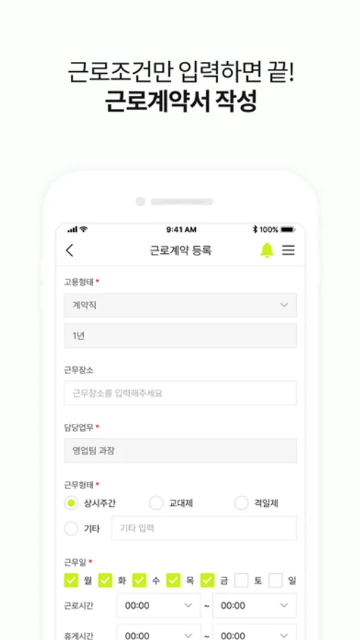 신규 직원 근로계약 정보(입사일, 고용형태, 근로시간, 휴게시간, 임금)를 입력하면 담당 노무사가 내용 검토 후 근로계약서를 등록합니다.