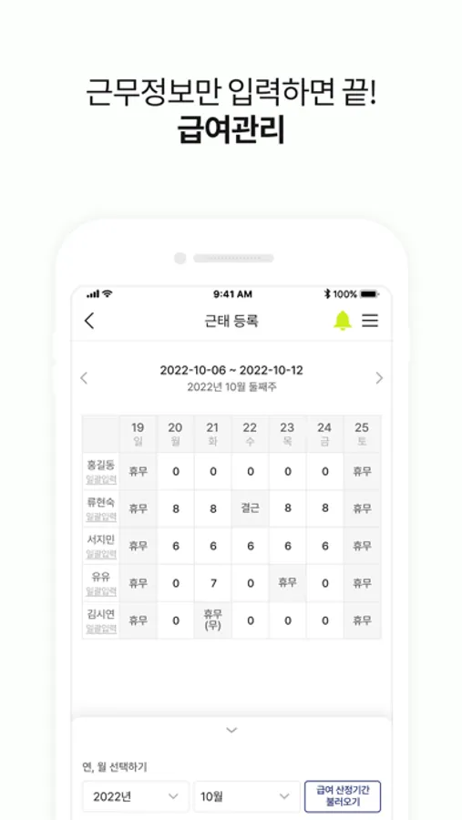 직원 근태 정보를 입력하면 담당 급여매니저가 직원별 급여를 계산하여 급여대장과 급여명세서를 등록합니다.