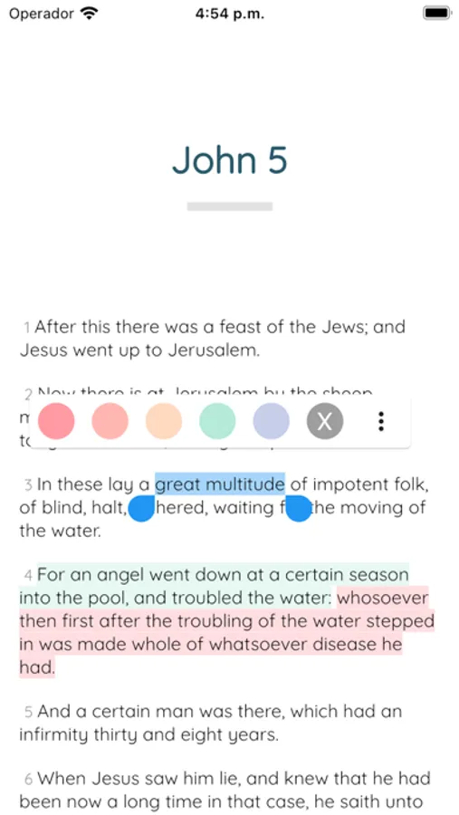 Highlighting: Users can select any-amount of text (multiple verses) and highlight from a natural palet of Pastel tones. These highlights are stored in your History page, making them easy to find later on.