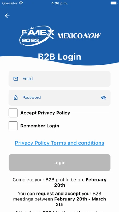 With this app you have the possibility to carry your B2B meetings in the palm of your hand. Consult, send receive and confirm bussiness appoiments with companies participating in the FAMEX 2023 event.