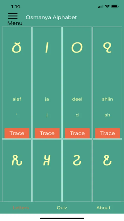 This app can help you get to know some of the indigenous Somali alphabets. Scroll through the letters and study their shapes and sounds. Practice tracing each one until you're familiar-- then quiz yourself on the letters!