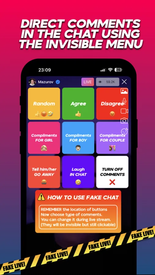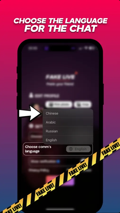 Fake Live also allows you to prank your friends and record their reactions to your stream with an inconspicuous button. And with the option to choose a language for comments, you can adapt your stream to any audience.