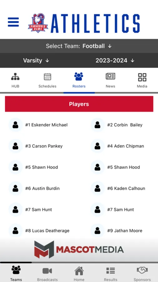 -Rosters: Current rosters by sport including jersey number, name, photo, position and grade.