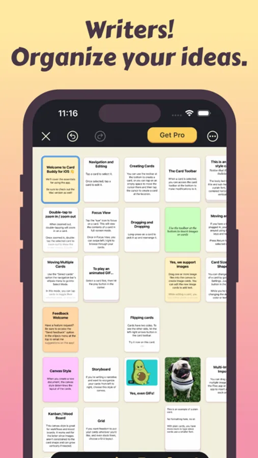 For writers and content creators, Card Buddy helps you research, collect, and organize, your ideas easily on a large canvas.