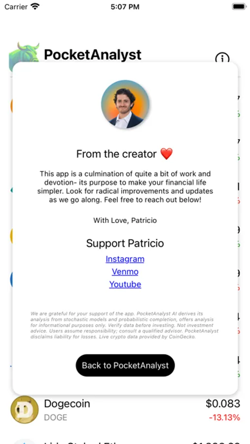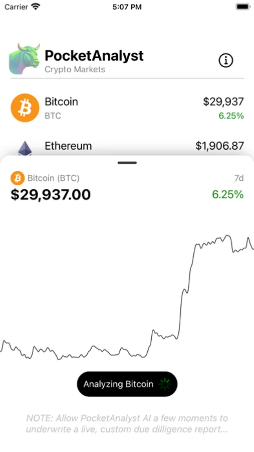 Pocket Analyst is currently a mobile app that analyses cryptocurrency data using artificial intelligence. We will add support for stocks, bonds/treasuries, Fed data, economic indicators, etc. The app will provide an increasingly personalized and comprehensive analysis to fit the users’ personal investment needs in an intuitive, affordable, and efficient way.