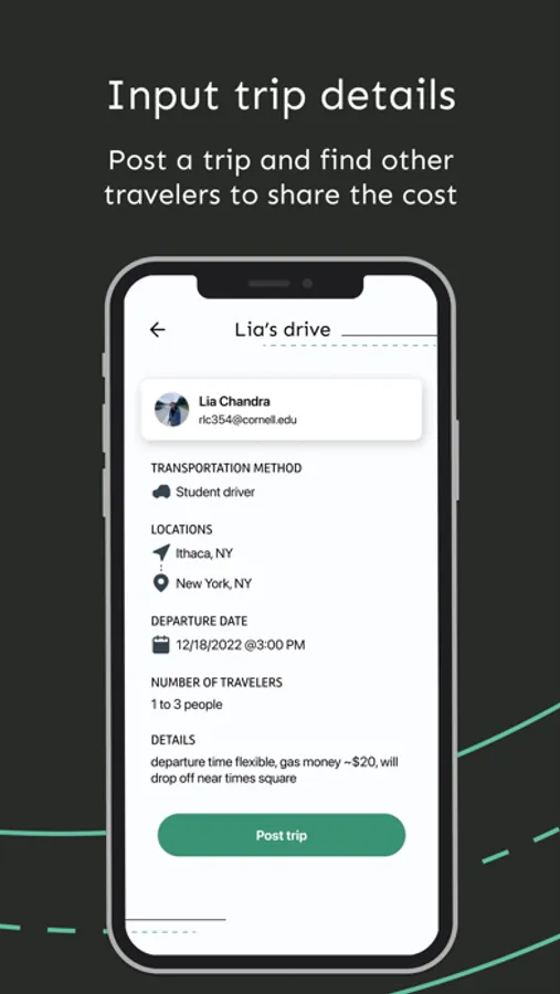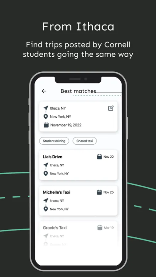 Cornell students want safe & affordable travel options to and from places within driving distance of Ithaca, and Scooped makes this dream a reality! Meet a new friend as you drive together to the Ithaca Airport or find Cornellians from your city as you carpool home together! The opportunities are boundless and you might end up making a friend along the way!