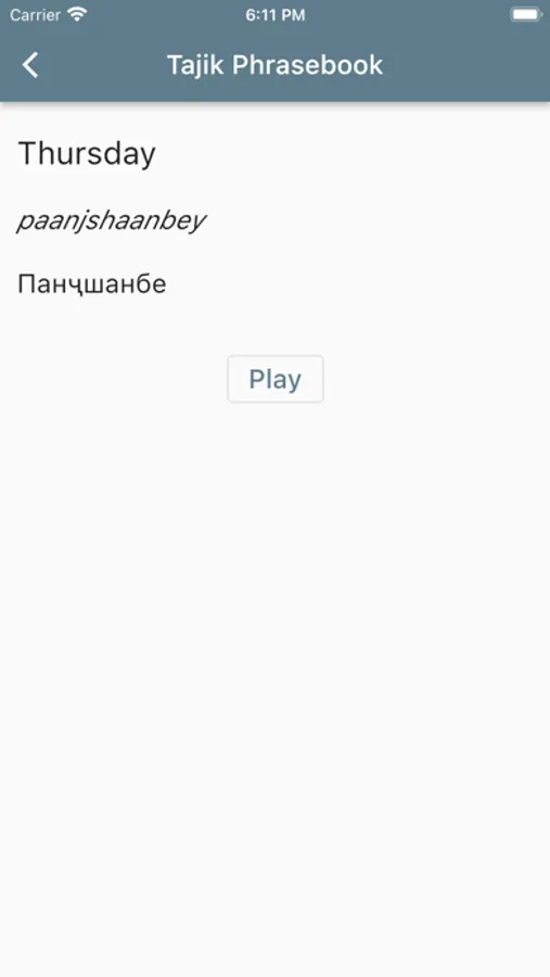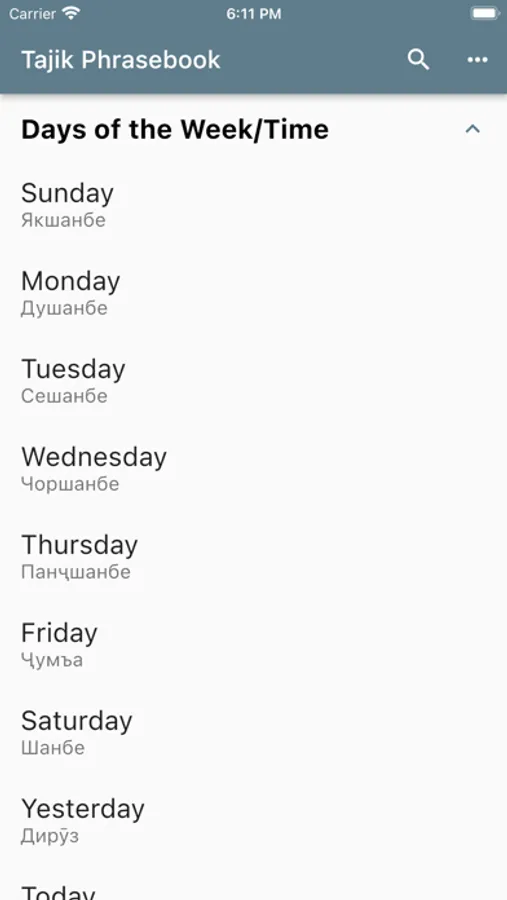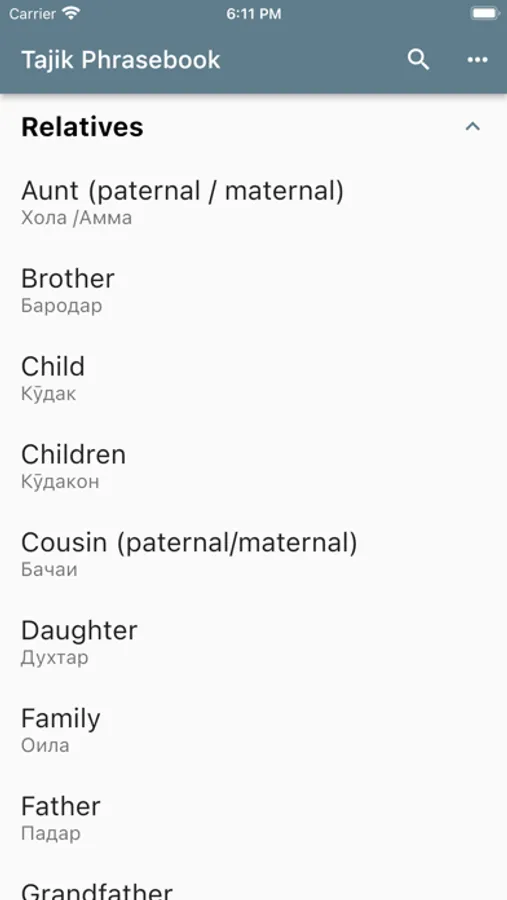 Using this app, you can select an English phrase and view its translation and how to pronounce it in Tajik.
