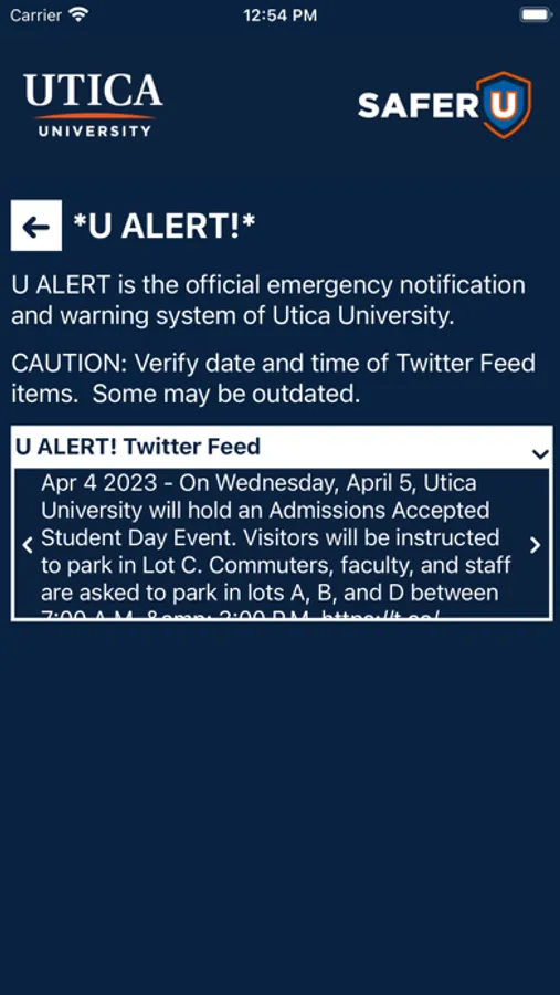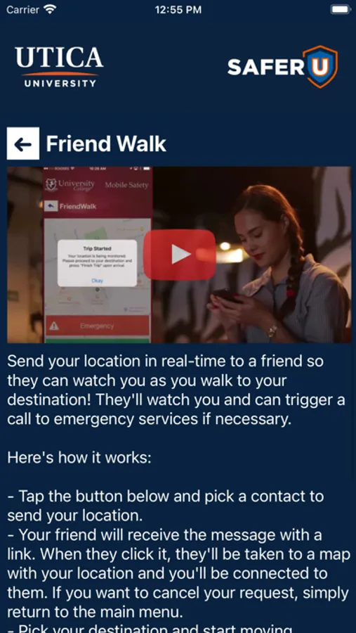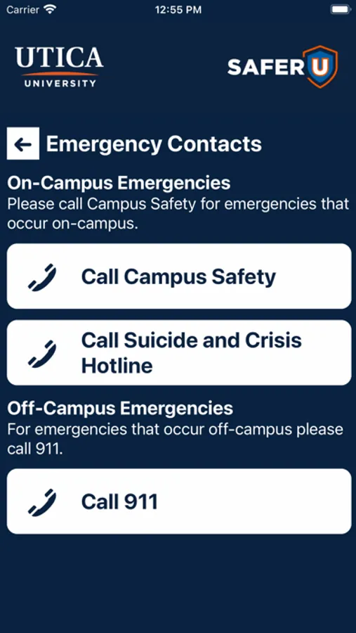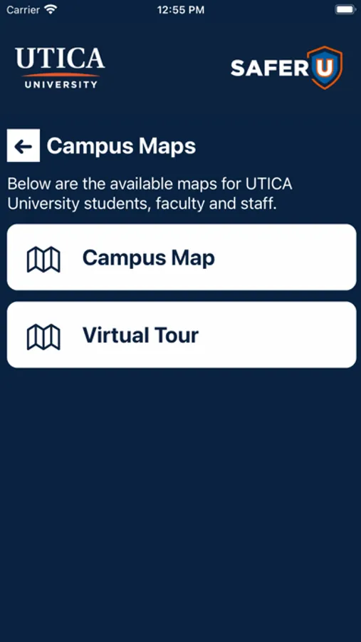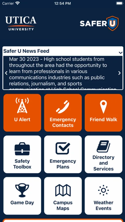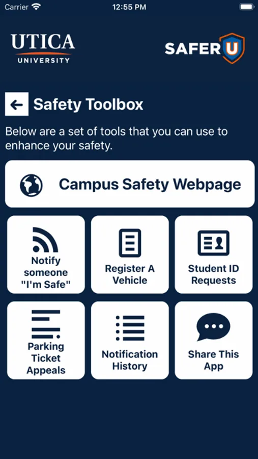SAFER U is the official safety app of Utica University. It is the only app that integrates with Utica University's safety and security systems. Campus Safety has worked to develop a unique app that provides students, faculty and staff with added safety on the Utica University campus. The app will send you important safety alerts and provide instant access to campus safety resources.