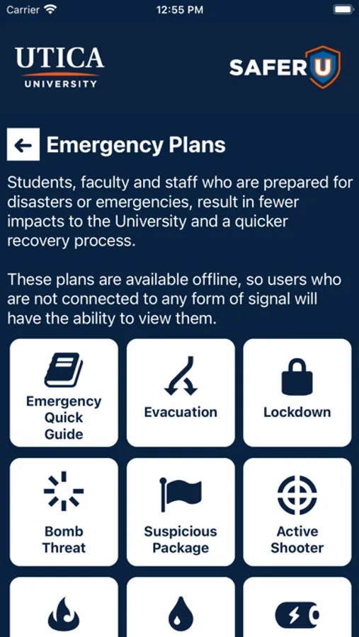 - Emergency Plans: Campus emergency documentation that can prepare you for disasters or emergencies. This can be accessed even when users aren’t connected to Wi-Fi or cellular data.