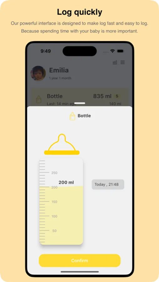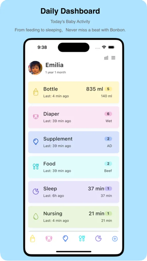 The ultimate tool for busy parents to keep track of their baby's daily activities. With Bonbon, you can easily log feedings, diaper changes, sleep schedules, growth, and more, all in one place. Say goodbye to complicated interfaces and hello to seamless tracking with our intuitive drag-and-drop feature. Plus, you can customize the interface to match your environment and reduce eye strain, especially during late-night feedings.