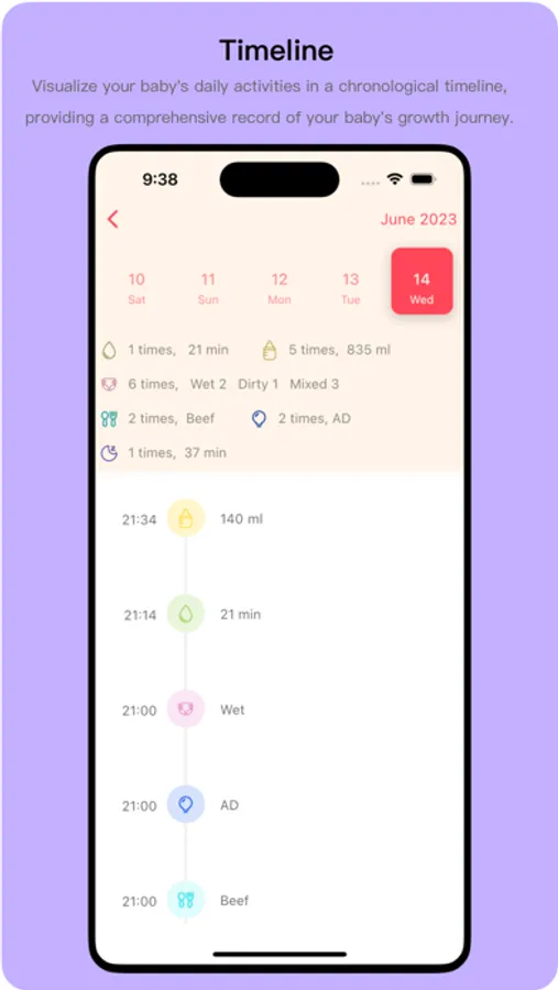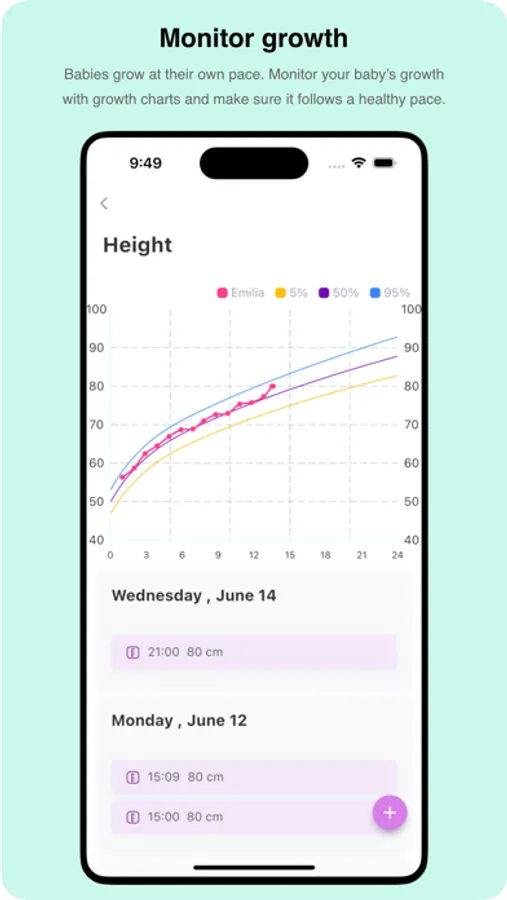 But Bonbon is more than just a simple tracker. Our app also provides growth charts and insights to help you monitor your baby's progress and make informed decisions. With Bonbon, you'll be able to record everything that matters, from milestones to medical information, and get timely reminders for upcoming events.