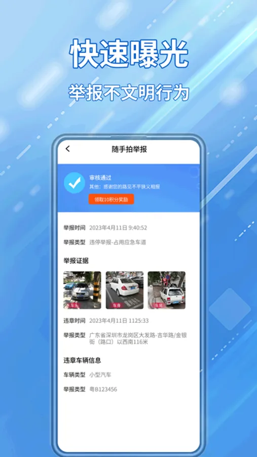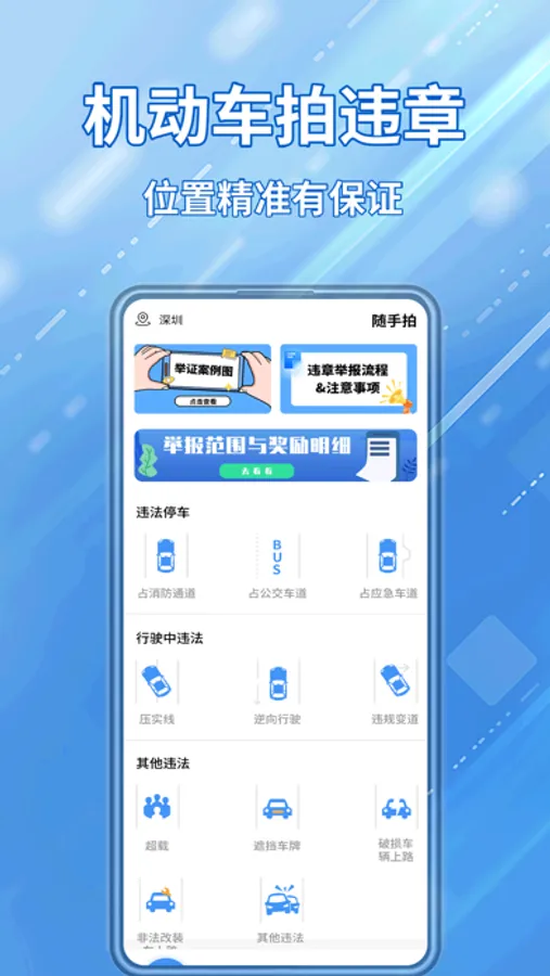 交通违章随手拍帮助您随时拍摄车辆照片及位置信息,并保存为本地照片。 交通违章随手拍是提供一个给用户的举报平台,用户提交举报不良行为,通过后即可获得奖励。