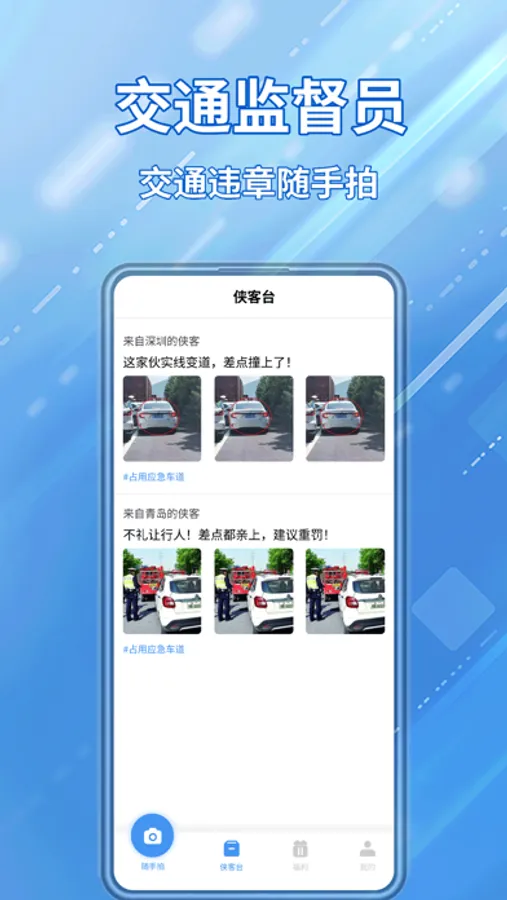 交通违章随手拍是一款本地便民生活资讯以及服务App。用户可以在侠客台上随手拍交通违章和不文明行为等等之类的。