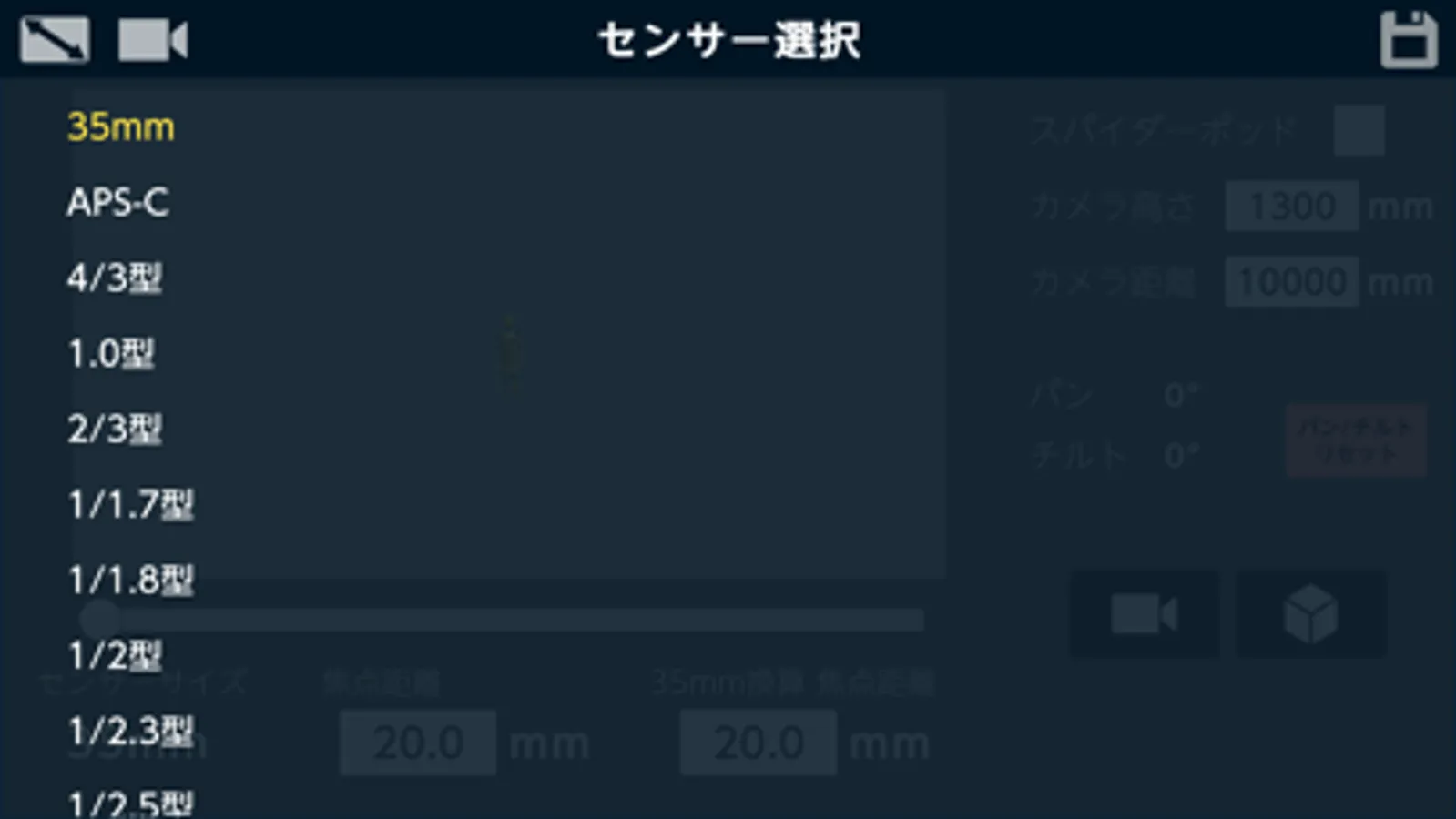 ・各カメラセンサーとその焦点距離に応じた画角確認