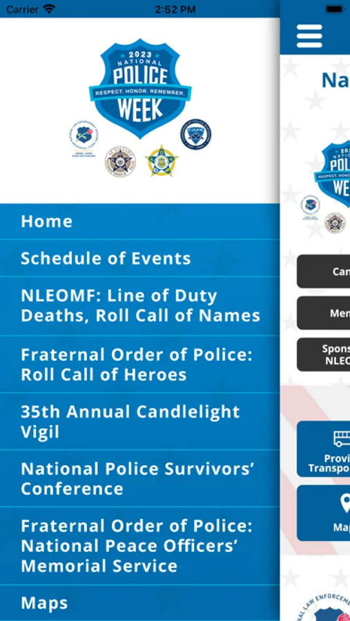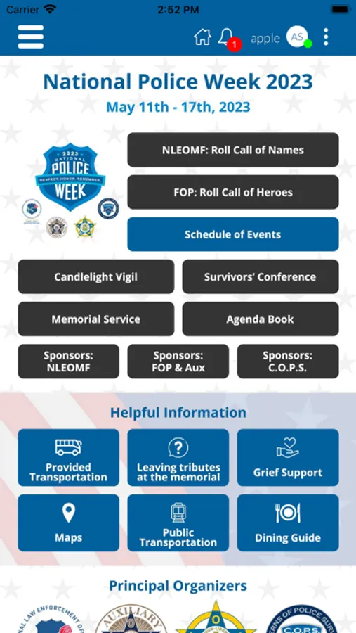 The National Police Week app is your go-to for crucial National Police Week information. Get notified as flagship events take place, find your way to landmark locations, virtually memorialize our beloved fallen heroes on the National Law Enforcement Officers Memorial, and find resources to help cope with the death of your officer.