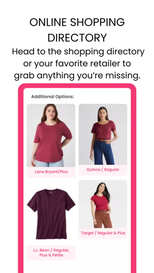 Every item on your shopping list includes a shopping directory of retailer links for you to browse as you curate your wardrobe. Links to items at the retailers you already know and love like Target, Amazon, H&M, Old Navy, LOFT, J.Crew Factory, Nordstrom + more can be found and are updated regularly – all you need to do is tap that ‘add to cart’ button. Link options are included for petite fit, tall fit, and plus size as well – our program is for everybody and every BODY!
