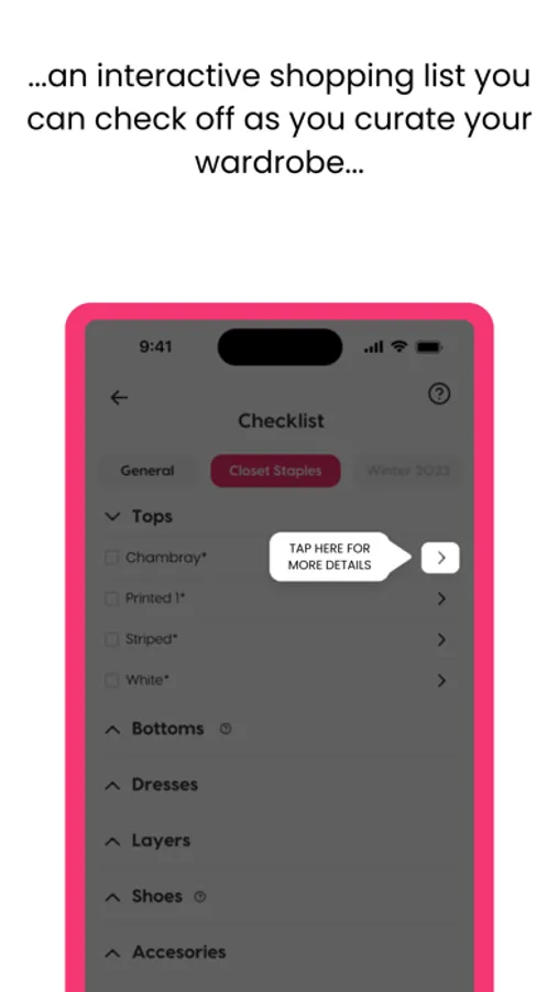 Your outfit calendar includes an Outfit Formula to style for every single day of the year. Just tap on today’s date to view the formula and check out which clothing articles it features. Head to your closet to grab the items in the formula, which you’ll already have handy since they were the same pieces on your shopping list, and voila – getting dressed has never been so easy! Each formula also includes suggestions on how to dress the formula up or down to suit your daily events. Once you are dressed you can tap the ‘Wore It Today’ checkbox to log your outfit styling streak!