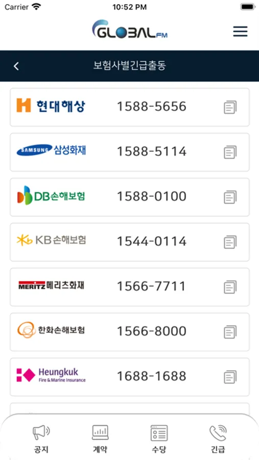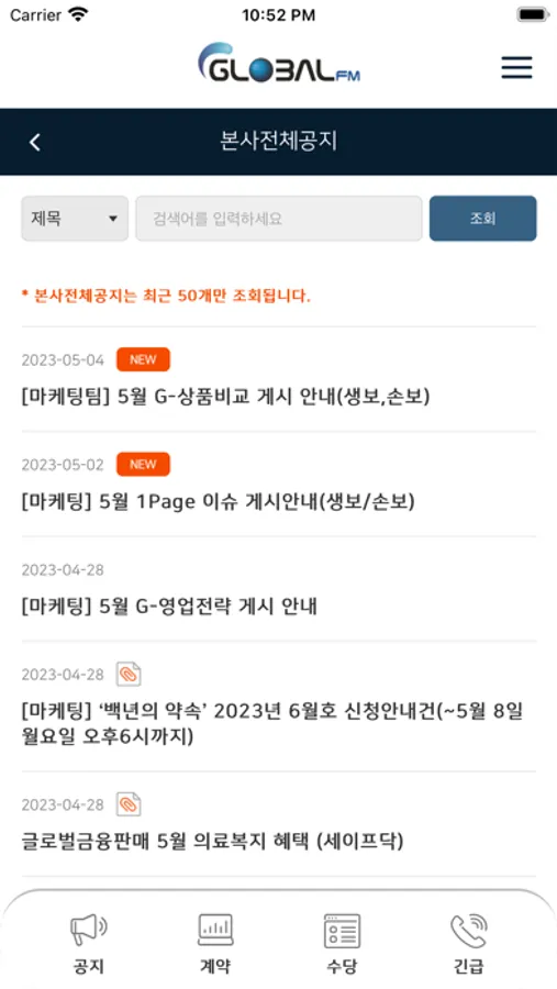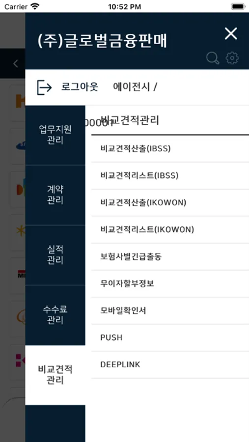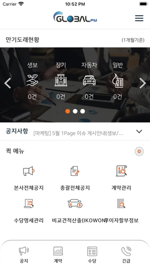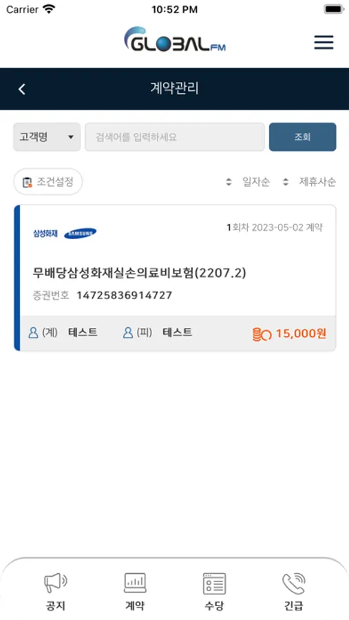 - 계약검색 / 만기도래계약 / 보종별 계약 / 고객정보확인