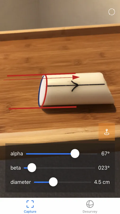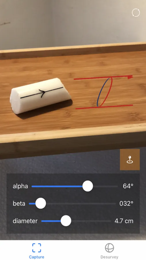 Point your device at a work surface in the coreshed to tether the app's augmented reality goniometric template. Measure rock pieces by interactively aligning with the template.