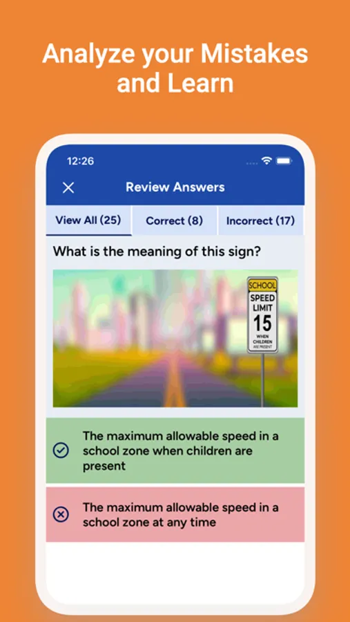 You will get the test result based on the official criteria to pass the Driver’s License Test. You will also be able to find out what questions you've done wrong after taking the test.