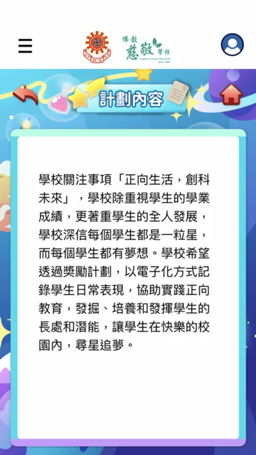 學校關注事項「正向生活,創科未來」,學校除重視學生的學業成績,更著重學生的全人發展,學校深信每個學生都是一粒星,而每個學生都有夢想。學校希望透過奬勵計劃,以電子化方式記錄學生日常表現,協助實踐正向教育,發掘、培養和發揮學生的長處和潛能,讓學生在快樂的校園內,尋星追夢。