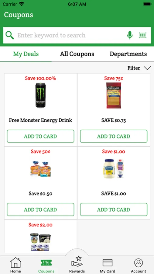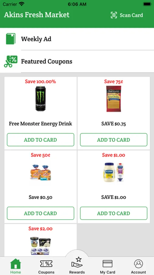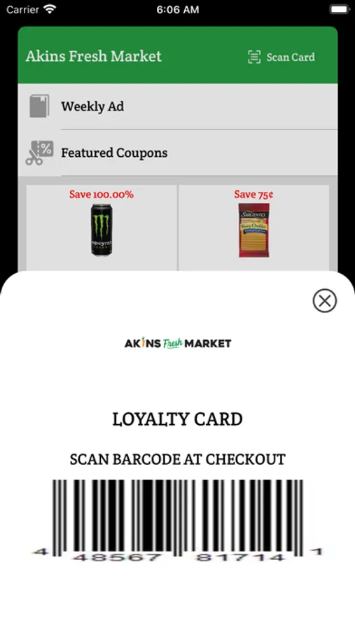 Akin’s Fresh Market app is the best way our loyal customers can receive savings every time they shop! Simply browse the coupons available, “Add to Card” the savings you want, and scan your phone at checkout.
