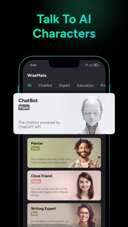 In WiseMate, we provide you with various skills of AI ChatBot characters. Whether you need to get artistic inspiration, writing guidance, fitness advice, math problem-solving, or just want the companionship of a close friend, WiseMate can help you find the most suitable chat character.